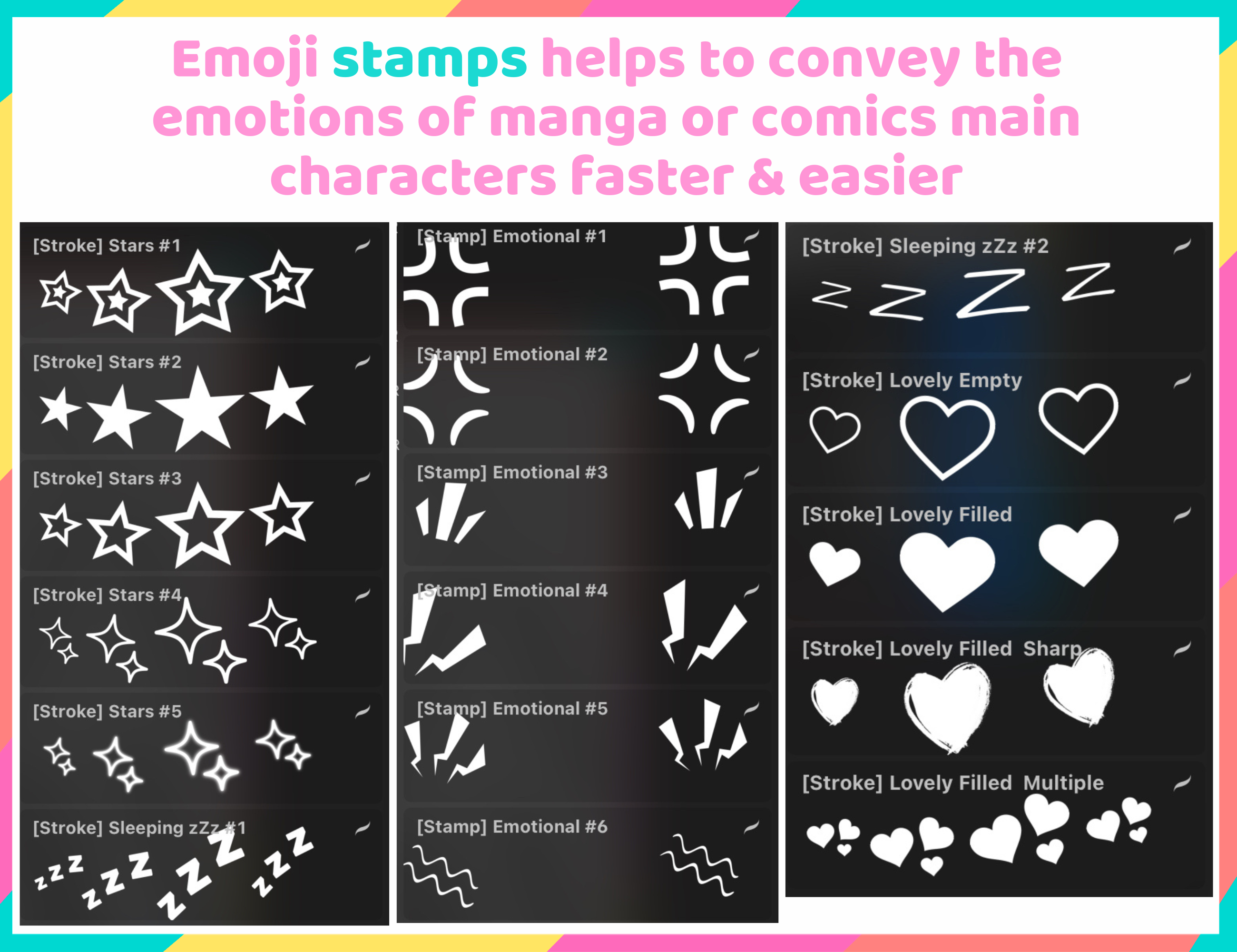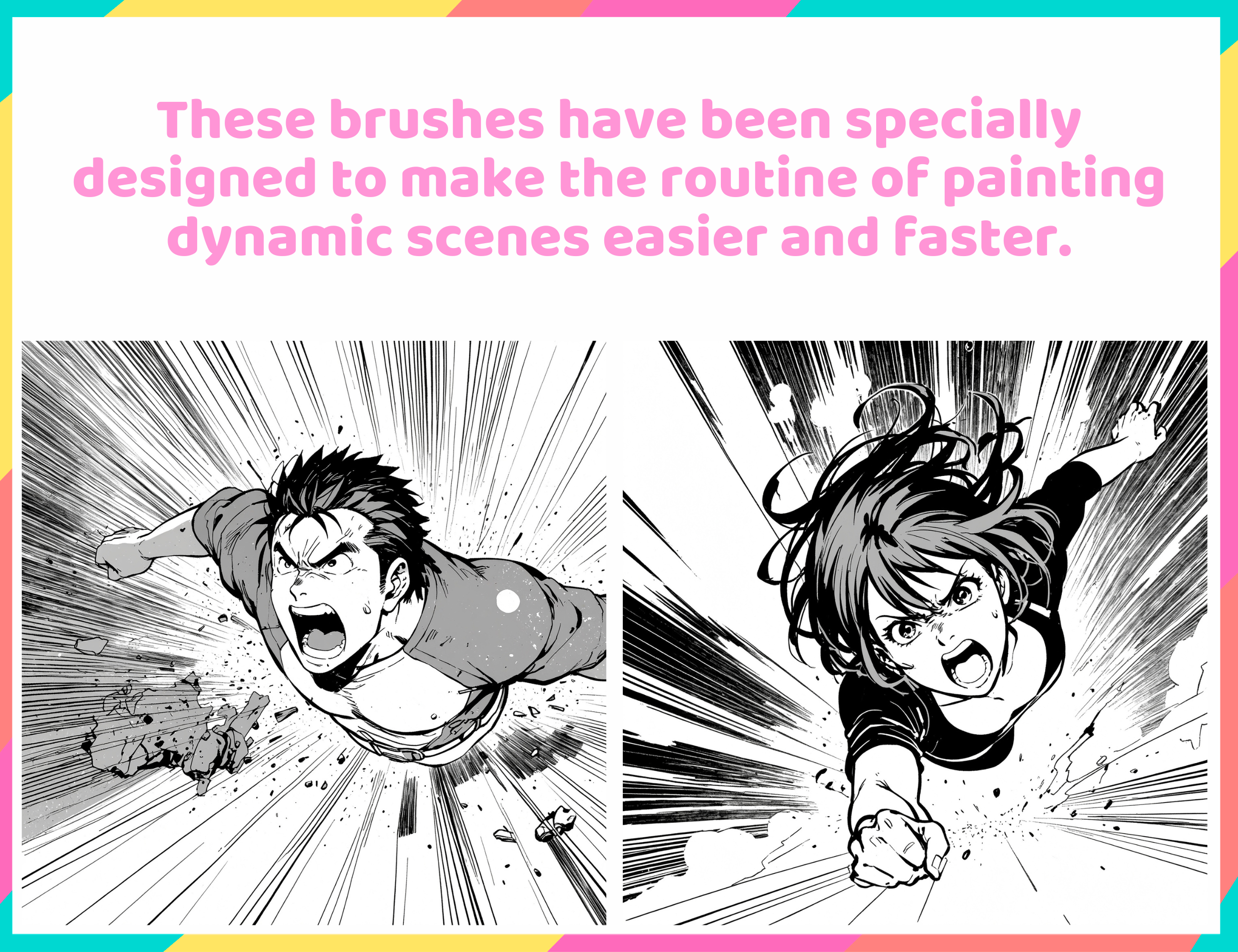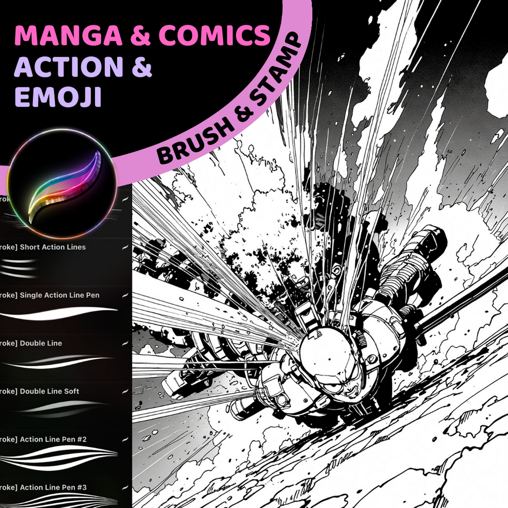 ▪️ This is the Manga/Anime toolbox for Procreate action scenes drawing. Including 35 brushes like stamp speed lines and pen strokes brushes for creating action and dynamic fighting or fast moving frames and scenes. Also brushes for fast creating character emotions like anger, astonishment ets (anime style character emotions).
